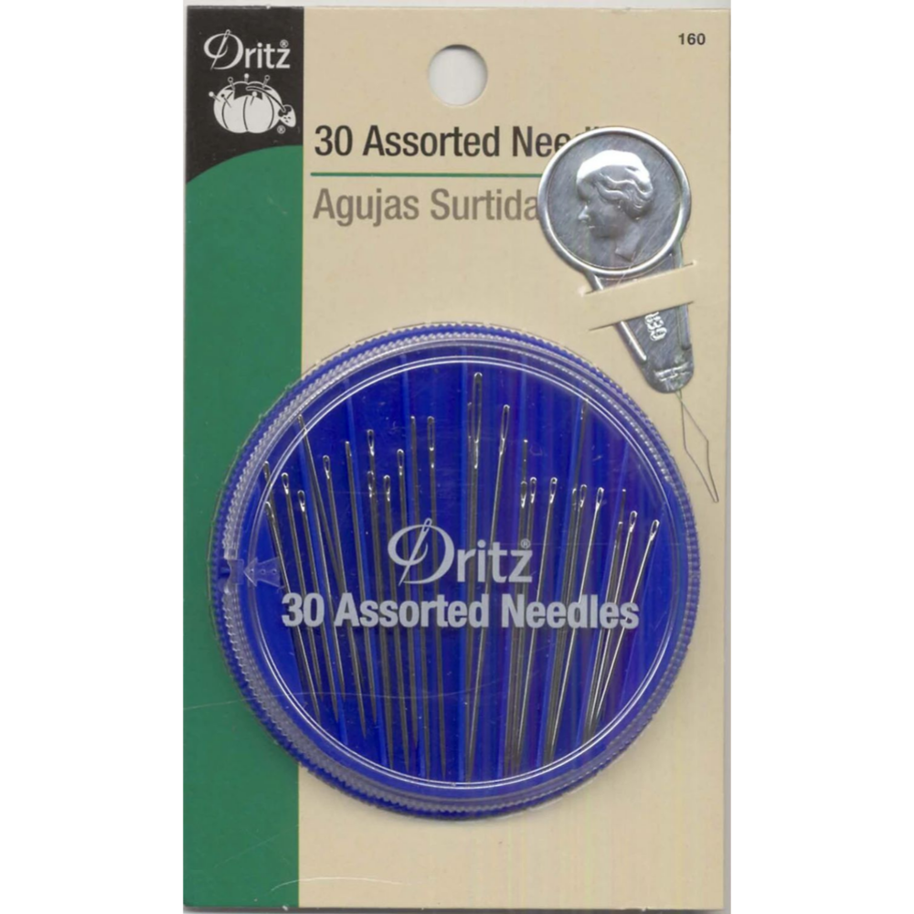 This convenient Dritz storage compact contains 30 assorted hand needles and a needle threader. Handy storage compact that easily dispenses needles. Includes Betweens, Sharps, Darners and Tapestry. Use the back of the compact to identify the needle size and style. Needle Threader included.