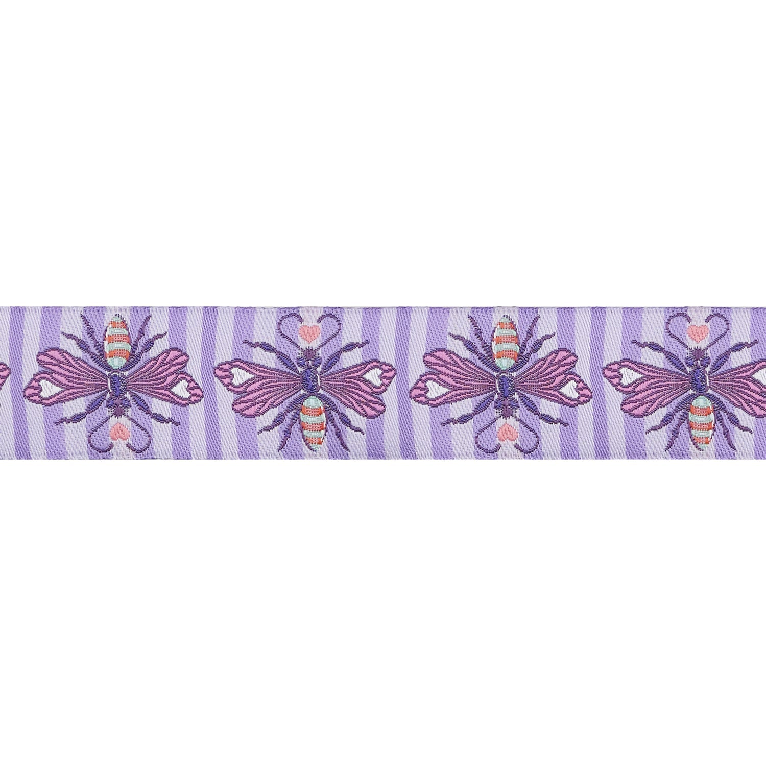 Unveil a touch of whimsy with the "Shake Your Honey Maker" jacquard woven ribbon from Tula Pink's Full Moon Forest II collection. This 7/8" wide ribbon features an adorable bee design set against a coordinating striped background, offering a delightful combination of charm and elegance. The clever name is perfectly reflected in the ribbon’s playful bee motifs, which buzz across a backdrop of coordinating stripes.