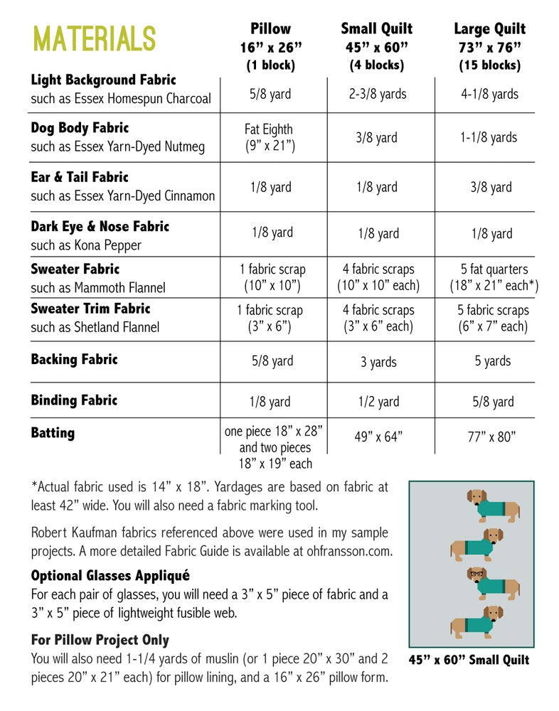 This pattern includes instructions for two quilt sizes and a quilted pillow cover featuring 12" x 19" patchwork dog blocks. All fabric is rotary cut and sewn together using conventional patchwork piecing. Please refer to the pattern back image for quilt sizes and materials requirements.