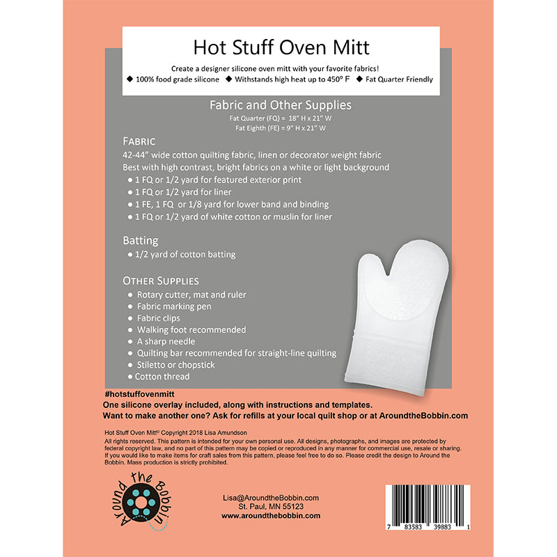 Create a designer silicone oven mitt with your favorite fabrics. Transparent silicone overlay, instructions and templates included. Makes one oven mitt approximately 13in x 7.5in. Silicone overlay is 100% food grade silicone and heat resistant up to 450 degrees. Just add 2 fat quarters of fabric and cotton batting. Refill silicone overlays available.