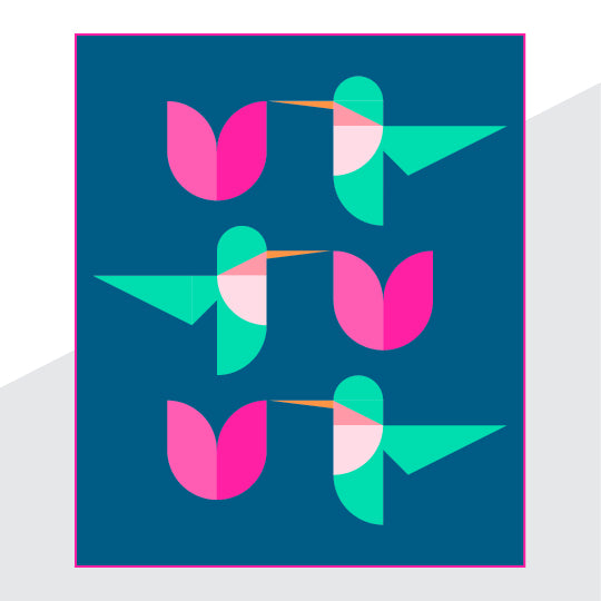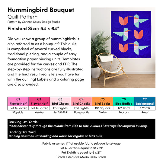 Did you know a group of hummingbirds is also referred to as a bouquet? This quilt is comprised of several curved blocks, traditional piecing, and a couple of easy foundation paper piecing (FPP) units. Templates are provided for the curves and FPP. The step-by-step instructions are fully illustrated and the final result really lets you have fun with the quilting!