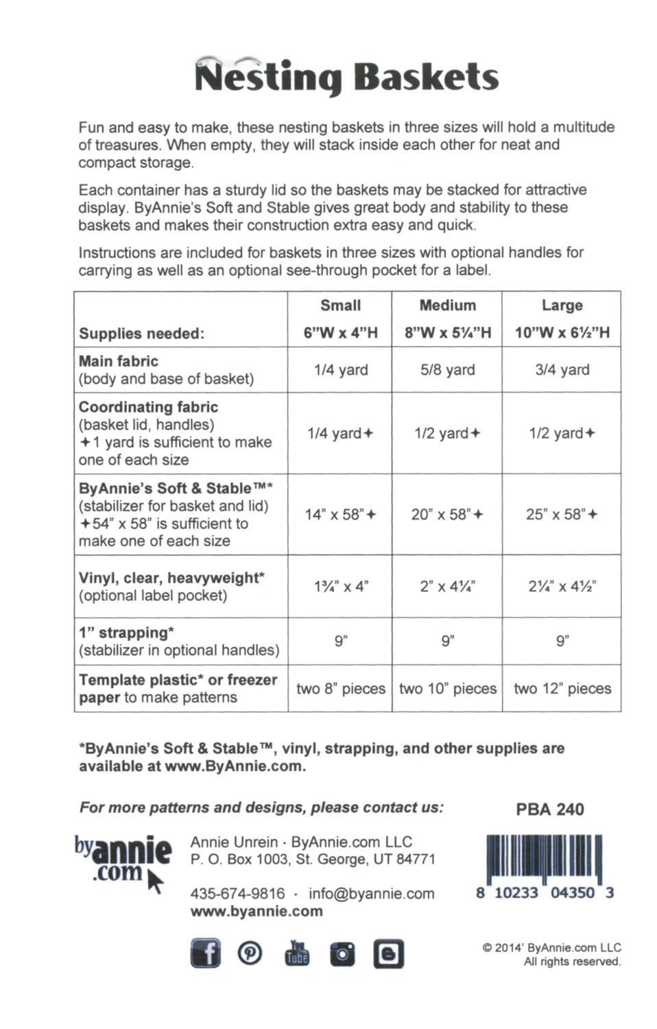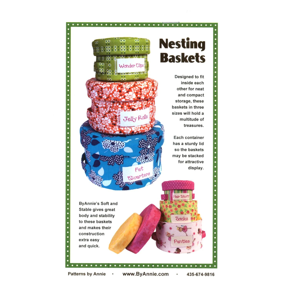 Discover the charm and practicality of these nesting baskets, designed to fit together neatly for efficient storage while providing ample space for your treasures. Available in three sizes - small, medium, and large - each basket boasts a unique fabric pattern, from vibrant green with white clips to floral designs and playful blue dots. Each basket features a sturdy lid, allowing them to be stacked attractively or used for display. Crafted with ByAnnie's Soft and Stable, these baskets offer both durability and ease of construction, making them ideal for quilters and crafters looking to organize their supplies stylishly. The included instructions guide you through creating these functional and decorative pieces, ensuring a professional finish with options for personalization like clear vinyl windows or mesh pockets.