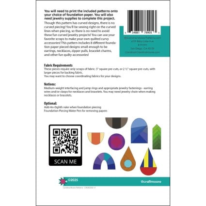 Though this pattern has curved designs, there is no curved piecing! You'll be sewing right on the curved lines when piecing, so there is no need to avoid these fun curved jewelry projects! You can use your favorite scraps to make your own quilted curvy accessories! This pattern includes 8 different foundation paper pieced designs small enough to be earrings, necklaces, zipper pulls, bracelet charms, and other fun quilty accessories!