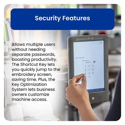 • Operational Features The Security Lock Modes can manage multiple users for businesses without multiple passwords and logins. The Shortcut Key allows the user to jump directly to the embroidery screen from multiple screens to save time. The Key Optimization System allows a business owner to customize access to machine functions to different roles.