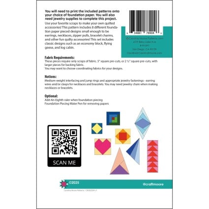 Use your favorite scraps to make your own quilted accessories! This pattern includes 8 different foundation paper pieced designs small enough to be earrings, necklaces, zipper pulls, bracelet charms, and other fun quilty accessories! This set includes classic designs such as an economy block, flying geese, and log cabin.