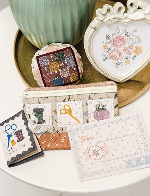 Featuring a door banner, in-the-hoop project bag with a fully installed zipper, needlebook, pincushion, and elegant quilt label using the Threads of Grace 10" Stacker.