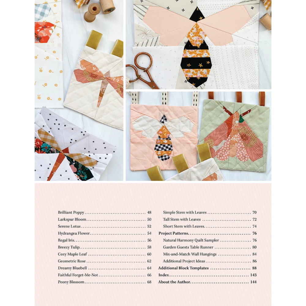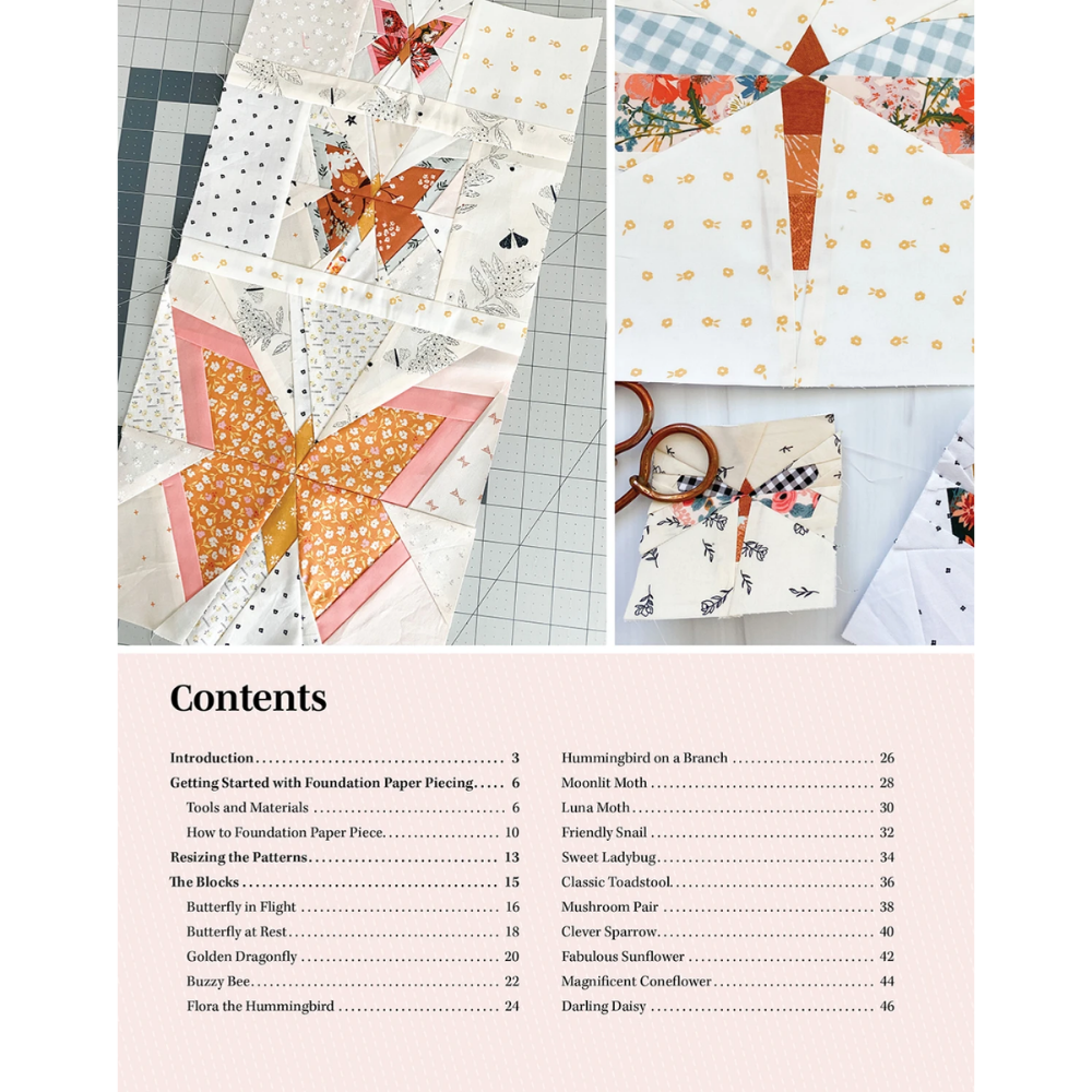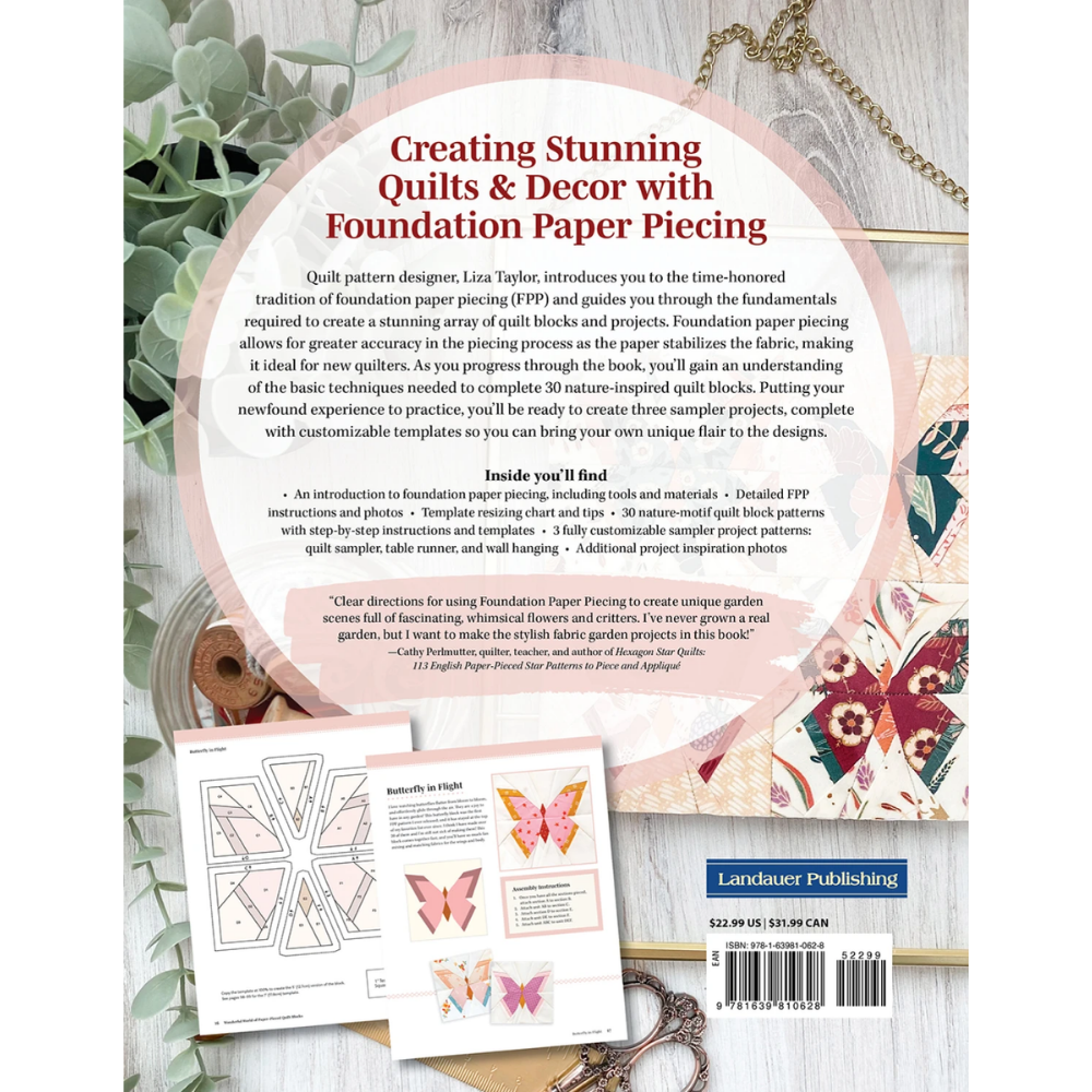 When you combine a sampler quilt with the ever-growing popularity of foundation paper pieced quilt blocks--those inspired by nature and gorgeous quilting prints -it's a win, win. Author Liza Taylor has created 30 flower and creatures-of-flight blocks that have a sophisticated sensibility. Individually, these blocks are beautiful; combined into a sampler quilt, they're fabulous. The blocks are so pretty that quilters may find themselves making extras for framing or wall hangings. The blocks are offered in two sizes 3" and 5", with on-page templates, but Liza instructs quilters how to enlarge a foundation pattern if they're looking for alternative size blocks and captures a fresh, modern vibe infused with the vintage charm of patchwork quilting.